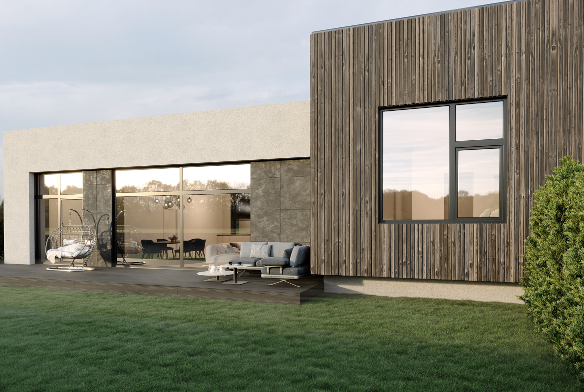 - Fasados: 300mm polistirolas, maumedžio dailylentės ir plytelės