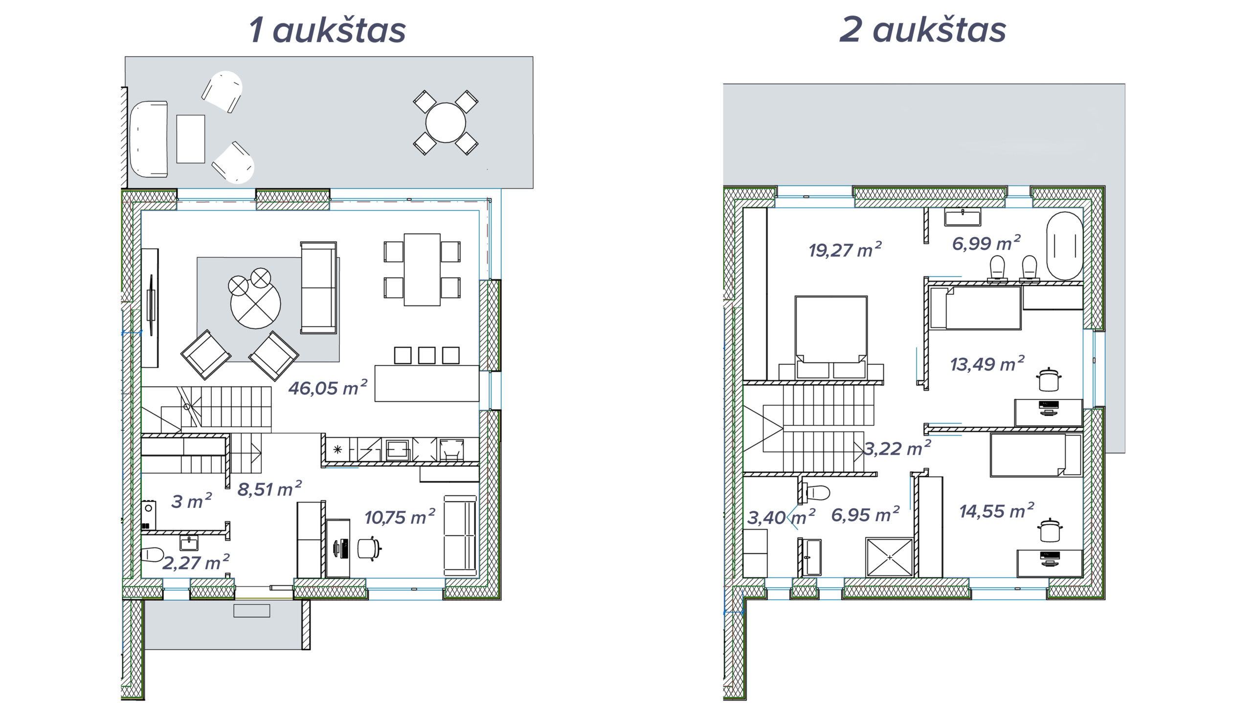 - Šildymas: numatytas oras vanduo (Daikin katilas)